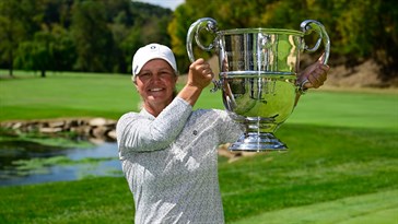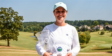 (Above: Three-Time CGA Women's Player of the Year, Dawn Woodard, Hoists the U.S. Senior Women's Amateur Trophy/USGA)