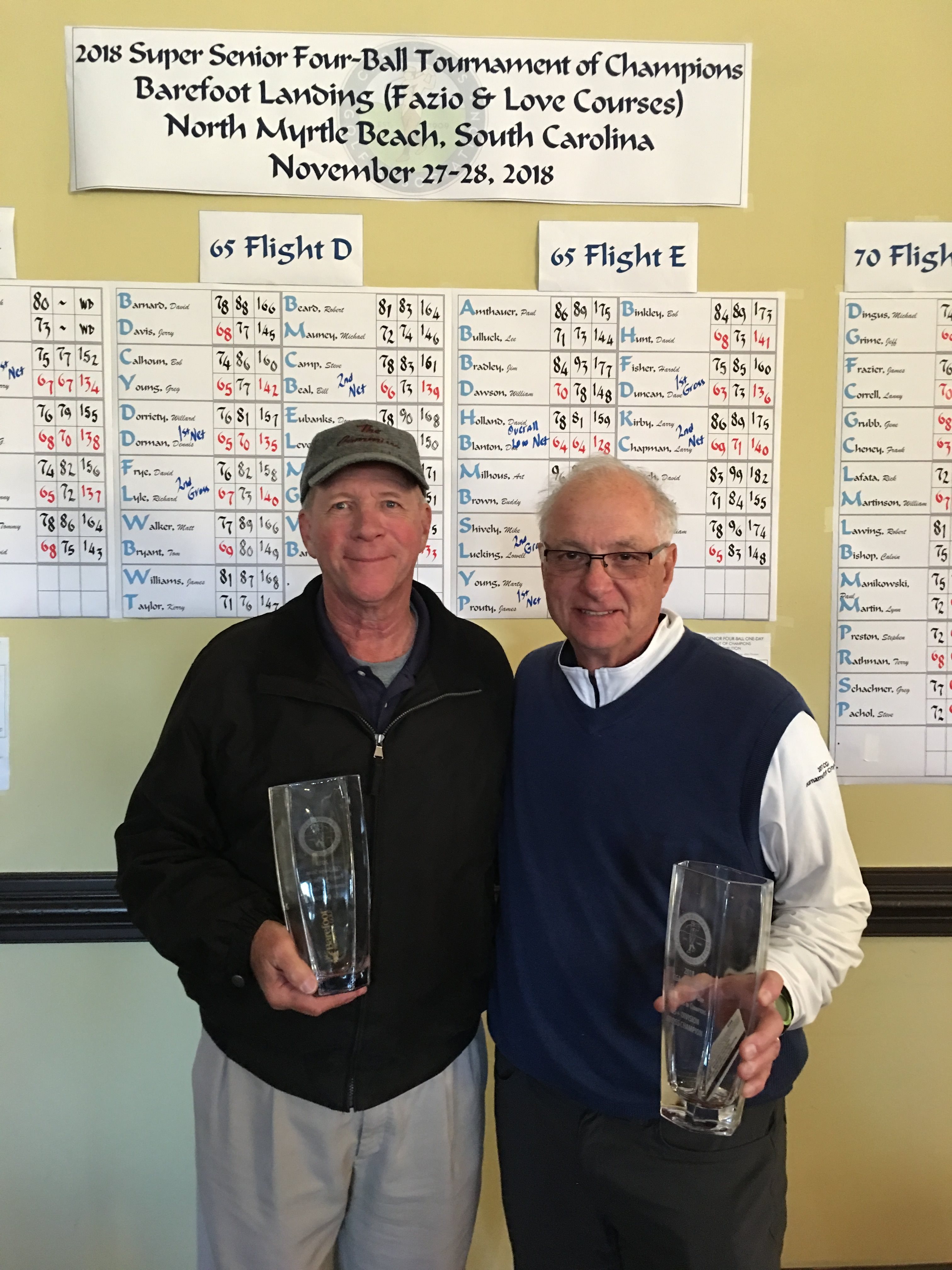 The Tournament of Champions crowns overall gross and net winners. The team of Alan Dirk, Pittsboro, N.C. / Ron Mambu, Naperville, IL won the overall gross title in the Super Senior 65+ Division with a two round total of 4-under par, 139. The net overall title in the Super Senior 65+ Division went to the team of David Holland, Forest City, N.C. / Don Blanton, Flat Rock, N.C. with a two round total of 16-under par, 128. The team of Stephen Preston, Charlotte, N.C. / Terry Rathman, Gastonia, N.C. won the overall gross title in the Super Senior 75+ Division with a two round total of 3-under par, 140. The net overall title in the Super Senior 75+ Division went to the team of Ben Payne, Greensboro, N.C. / Travis Jones, Greensboro, N.C. with a two round total of 17-under par, 126.